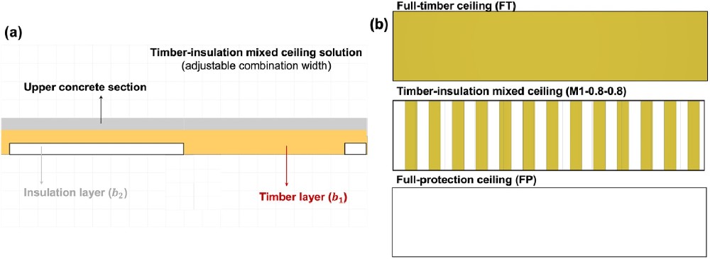 Driven by sustainability, ease of construction, and aesthetic appeal, the utilization of engineered timber products is increasingly favoured in modern architecture. However, their combustibility and potential rapid flame spread are obstacles to widespread implementation. Full-scale fire tests have shown that ignition of a timber ceiling, led to rapid fire spread and large heat release rates. To mitigate such intense fires, a conceptual design of a mixed ceiling, consisting of a lower surface with alternating timber strips and insulation strips combined with a concrete upper surface, has been proposed. Full-scale CFD fire models, were initially established and validated with reference to the Malveira fire test, and subsequently extended to accommodate different ceiling configurations, including full-timber ceilings, timber-insulation mixed ceilings with different widths, and fully protected ceilings. The simulation results showed that mixed ceiling strategies have the potential to mitigate the rapid spread of fire. In large open compartments where floor fuel loads are arranged discontinuously, resembling real fire scenarios, even cases with non-optimal stripe combination widths demonstrate rapid fire mitigation effects approaching 6.0 min. Additionally, mixed stripe cases based on performance studies can limit combustion to localized fires within 30.0 min. These findings contribute to the safe utilization of mass timber in modern compartments and for practicing engineers to assess further design options.