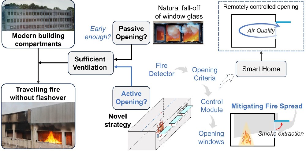 Modern buildings are now usually designed of large open-plan space and large glass windows. Differing from the conventional small compartment fires of limited ventilation, compartment fires in modern buildings are likely to exhibit a localized fire travelling along the floor plan without flashover. Noted that windows were assumed as initial openings in such fire tests aiming for travelling fire behavior, which is justified by early-stage glass breakage in fires. In this paper, the effect of window glass to fire development has been questioned and investigated, which is followed by the data analysis to understand the fire mitigation mechanisms of a novel ‘active opening’ strategy. It is a counter-intuitive strategy to actively open glass windows after detecting a fire, with the purpose of mitigating fast fire spread. Two scaled compartment fire tests have been conducted, as the first ever experimental evidence pointing out the strikingly different fire development paths due to glass existence and active opening. The corresponding CFD fire models have been established with validation to provide more comprehensive information for understanding the interaction mechanisms. By analyzing the histories of heat release rate, smoke characteristics, and floor heat fluxes, it is found that the localized fire at early stage could not create fall-off of the window glass to form ventilation, and the expected smoke venting occurs until the fire flames rapidly spread. Through the analyses, it has proved that actively opening windows could effectively reduce the smoke thickness and temperature, reducing the heat radiation to the adjacent floor fire load. While not intensifying the growth of localized fire, the active opening strategy could immediately reduce smoke accumulation, and successfully prevent fire spread. These would ultimately ensure the safety of people, reduce the damage to building structures, and facilitate firefighting.